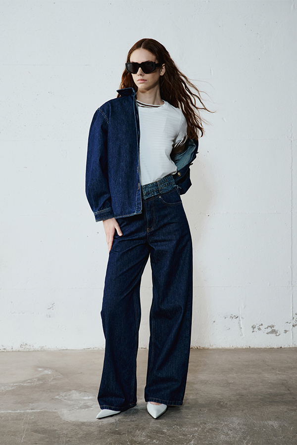 Discover the contrast between the palest wash and deep blue, with boxy jackets and midi skirts featuring a front slit. Layering and texture for a bold look.