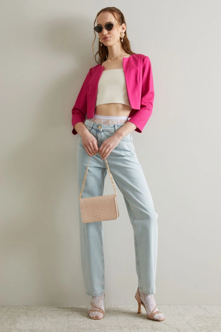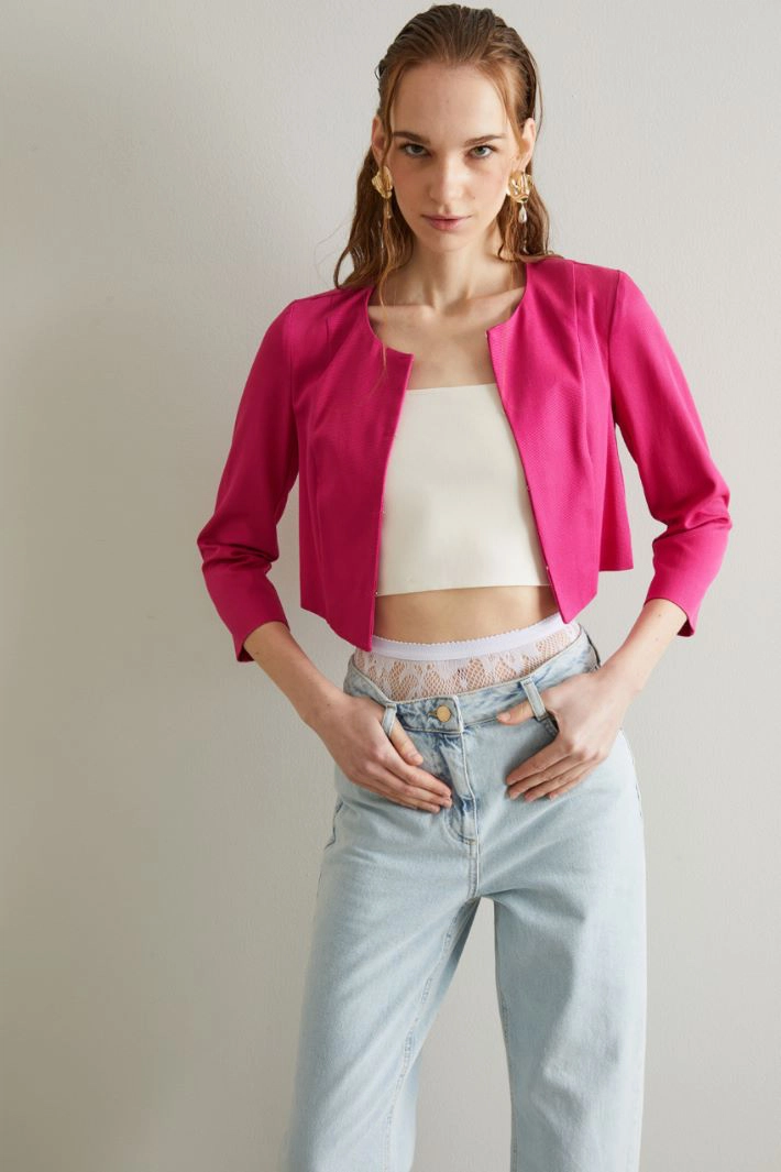 Straight-cut bolero in stretch cotton blend faille, with round neckline and three-quarter sleeves. Hook fastening. Unlined.