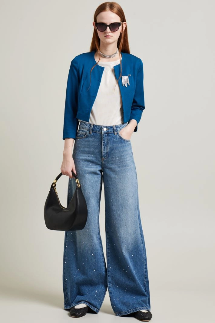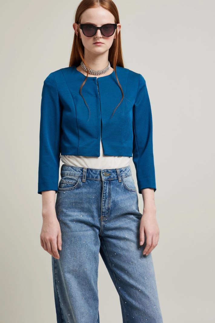 Straight-cut bolero in stretch cotton blend faille, with round neckline and three-quarter sleeves. Hook fastening. Unlined.