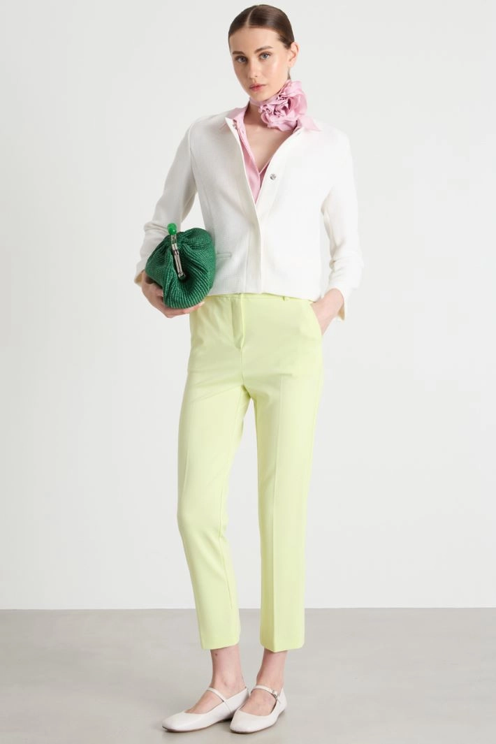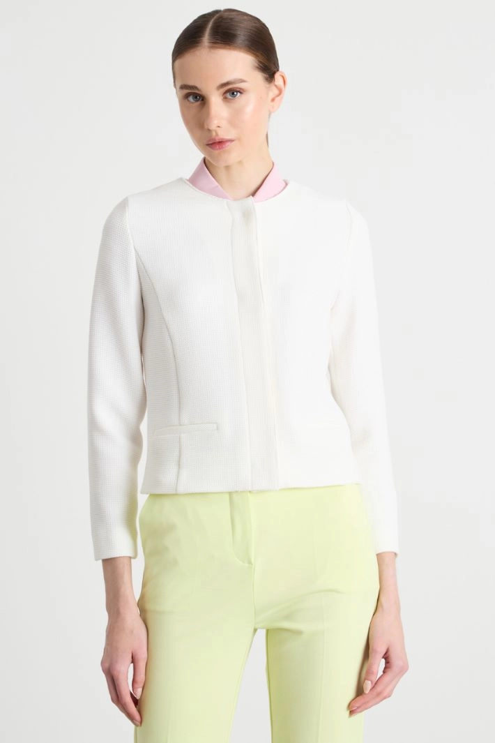 Fitted jacket crafted in basketweave fabric, with a round neckline, long sleeves and welt pockets. Concealed press-stud fastening.