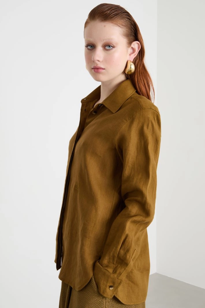 Crafted from pure linen, this loose-fit shirt features a classic pointed collar, long sleeves with buttoned cuffs, a rear yoke with a pleat, and a dropped-back hem with side slits. Concealed button fastening.