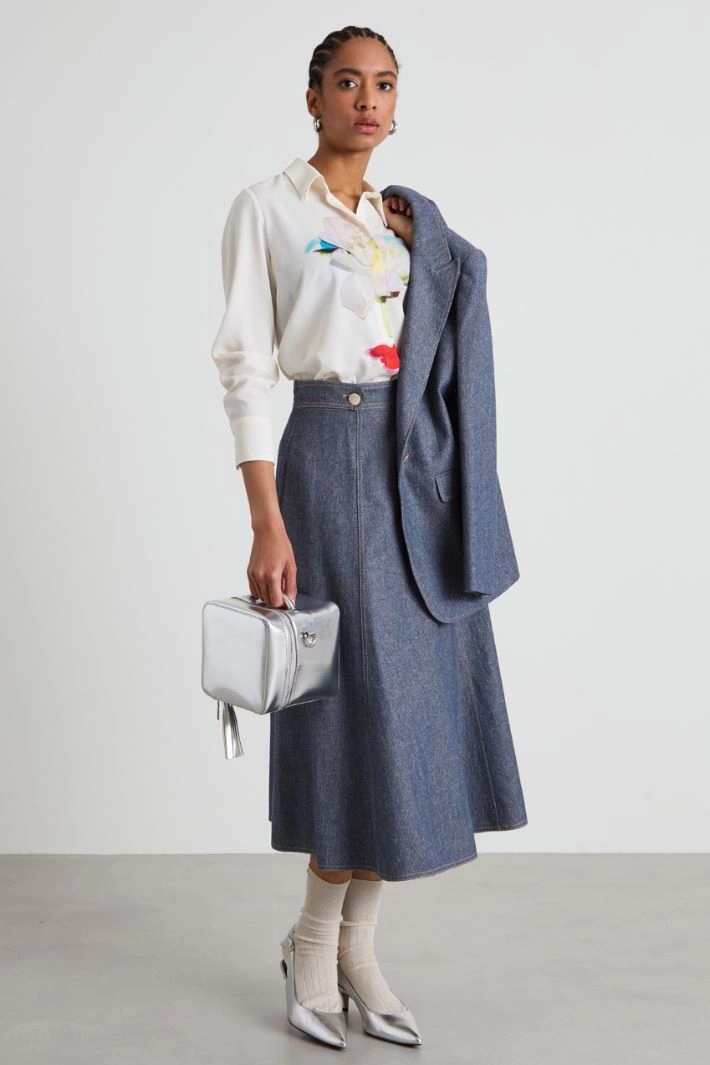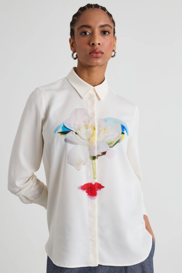 Straight-cut shirt in glossy-finish enver satin with print, classic collar, long sleeves with cuff and button, and asymmetrical hem that is longer at the back. Concealed button fastening.