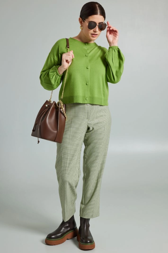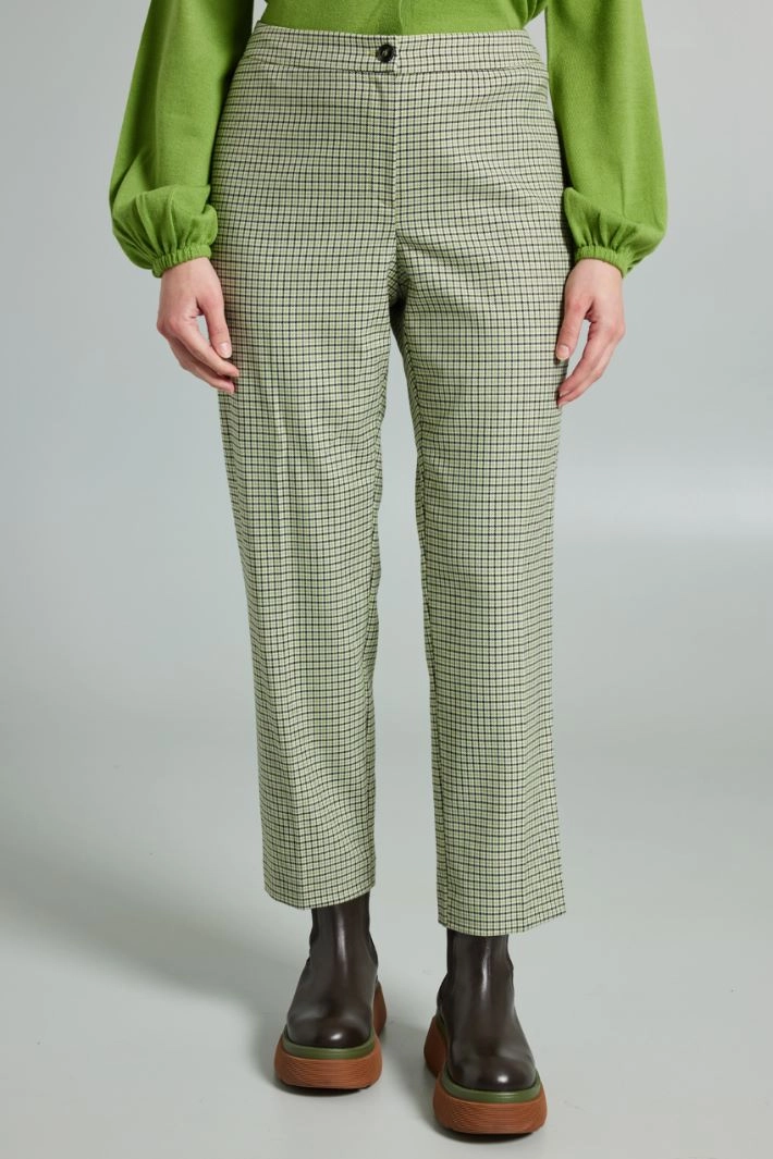 Cigarette trousers in stretch viscose blend fabric, with elastic insert at the waist on the back and fastening with a hidden zip and button.