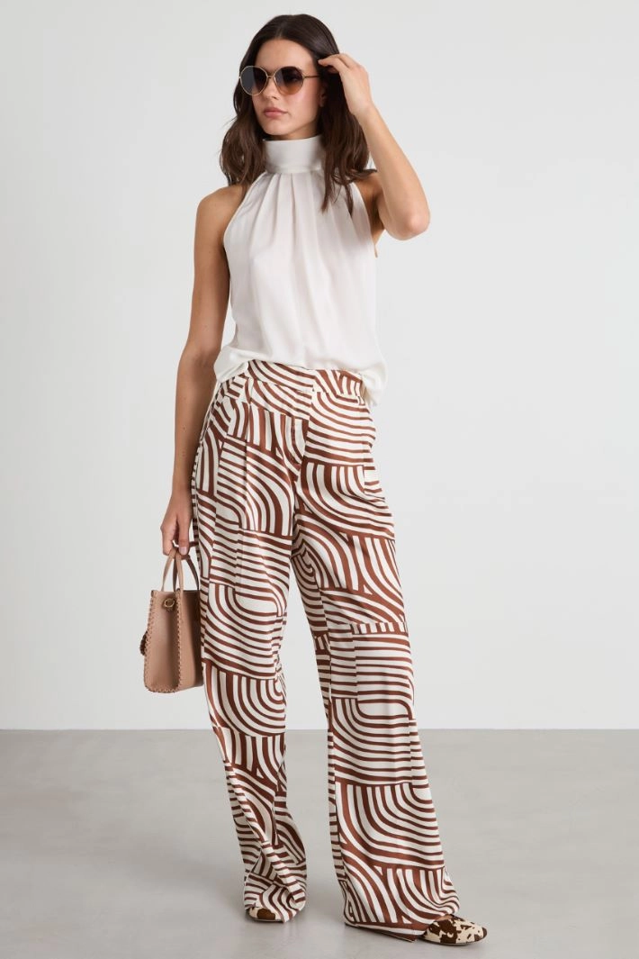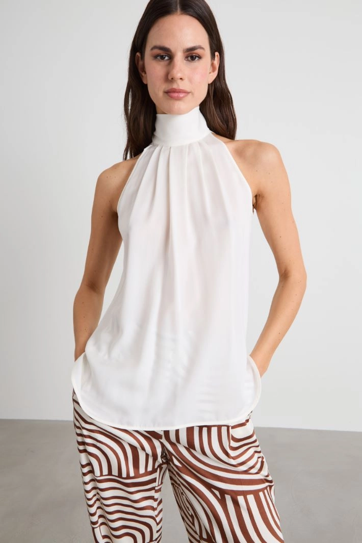 Flowing halter top in pure silk fabric, with a high neckline finished with a pleated motif, sleeveless and side slits at the bottom. Teardrop fastening with covered buttons on the back.