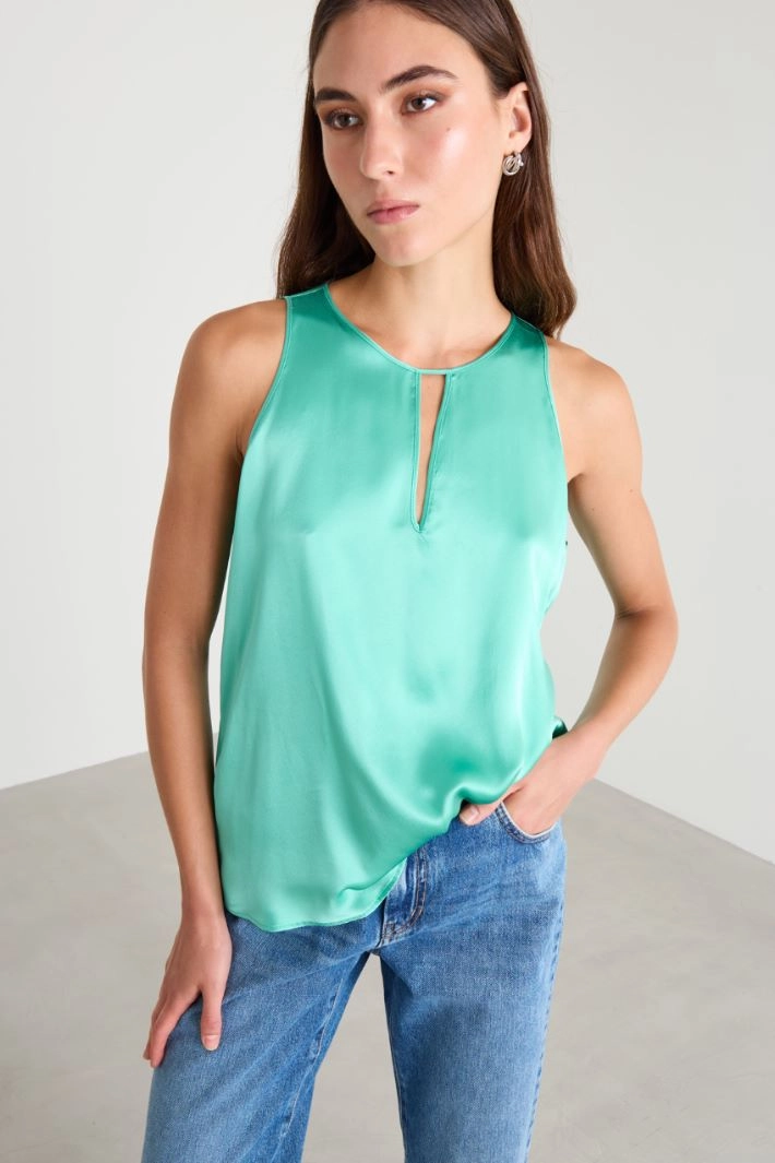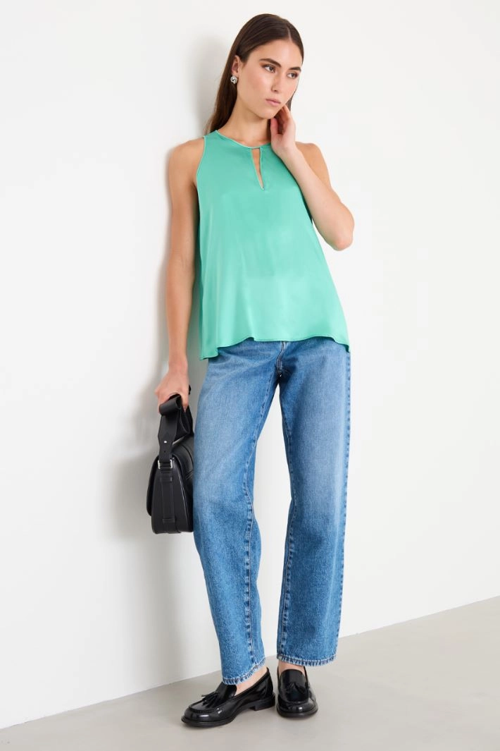 Straight-cut top in printed pure silk satin, with crew neckline, cut-out detail on the chest and keyhole fastening with button on the back.