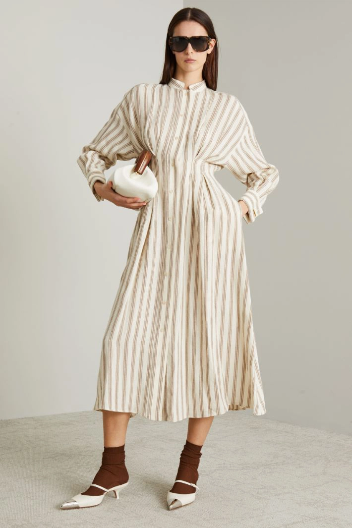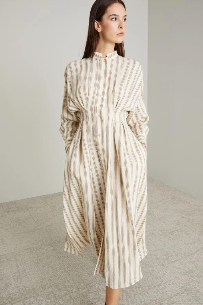 Flared dress in yarn-dyed linen with Mandarin collar, long sleeves with double-cuff. Side pockets. Button fastening.