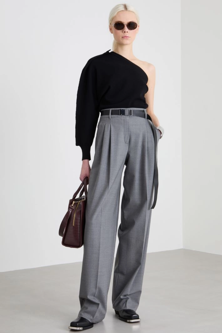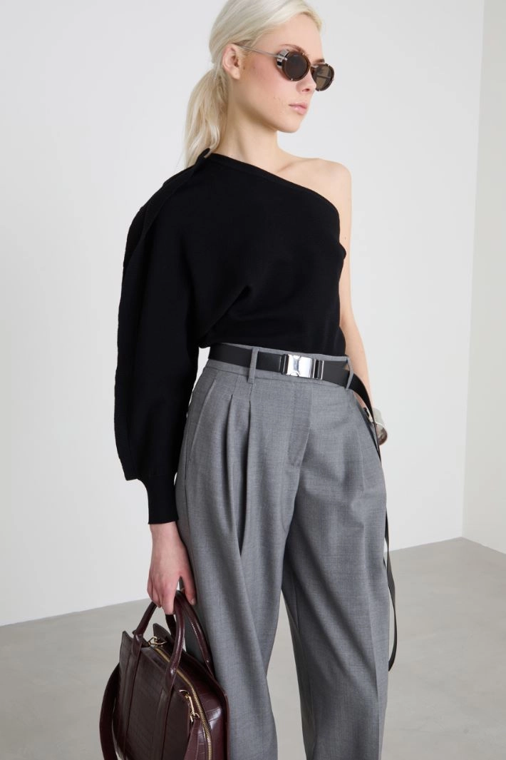 Loose-fit one-shoulder sweater in viscose blend yarn, with an asymmetrical neckline, a ruffle motif on the right sleeve and ribbed edges.
