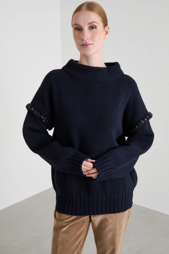 Oversized sweater in pure wool yarn, with a crater neck and long dropped sleeves embellished with rhinestone embroidery. Ribbed trim.