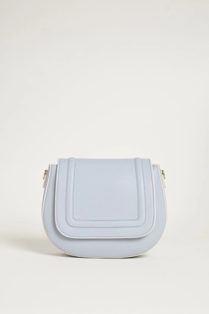 Rounded bag in tumbled coated fabric, featuring a flap with an embossed motif, an adjustable and removable shoulder strap, tonal stitching, contrasting trim and an internal zipped pocket. Magnetic button fastening.