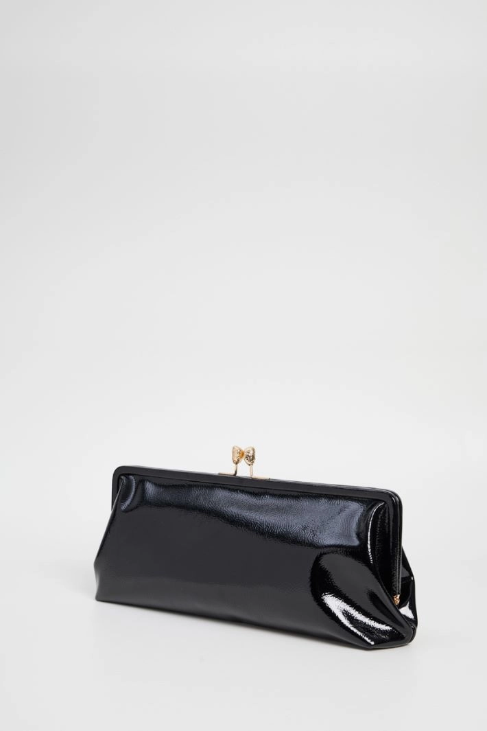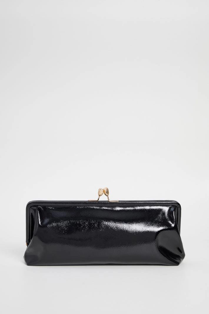 Rectangular clutch in patent-effect faux leather with a metallic snap closure and lined interior.