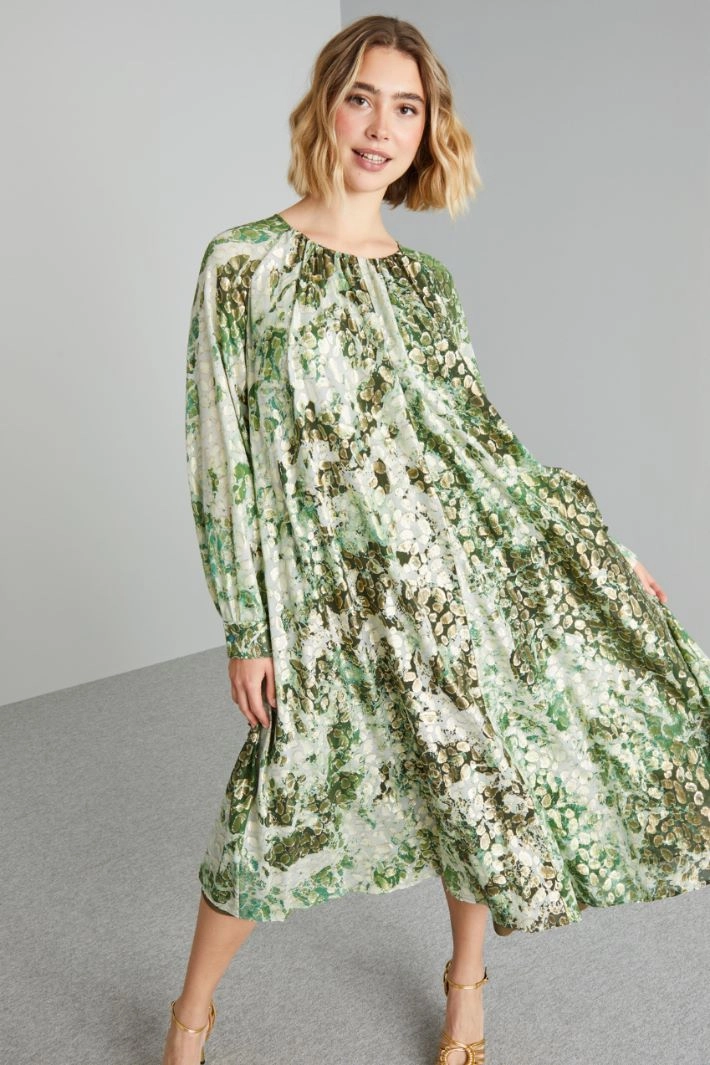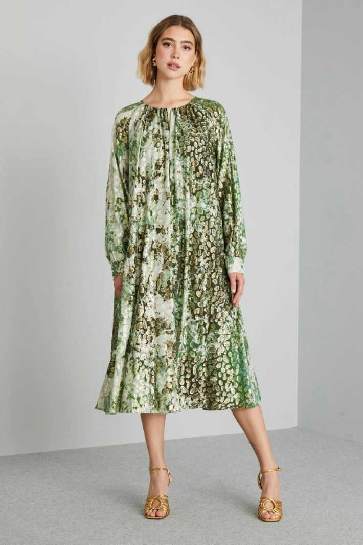 Loose-fitting dress in printed silk blend fil coupé, with lamé fiber insert, gathered round neckline, long raglan sleeves with cuff and button, keyhole fastening with button on the back. Partially-lined.