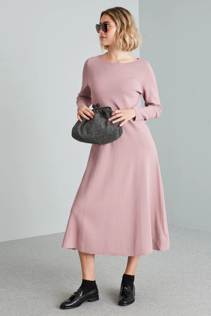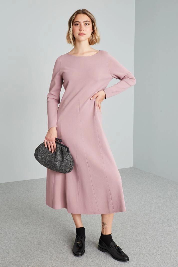 Flared dress in viscose blend crepe knit, with boat neckline and long sleeves.
