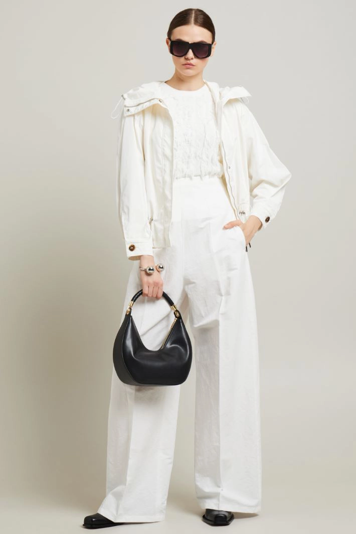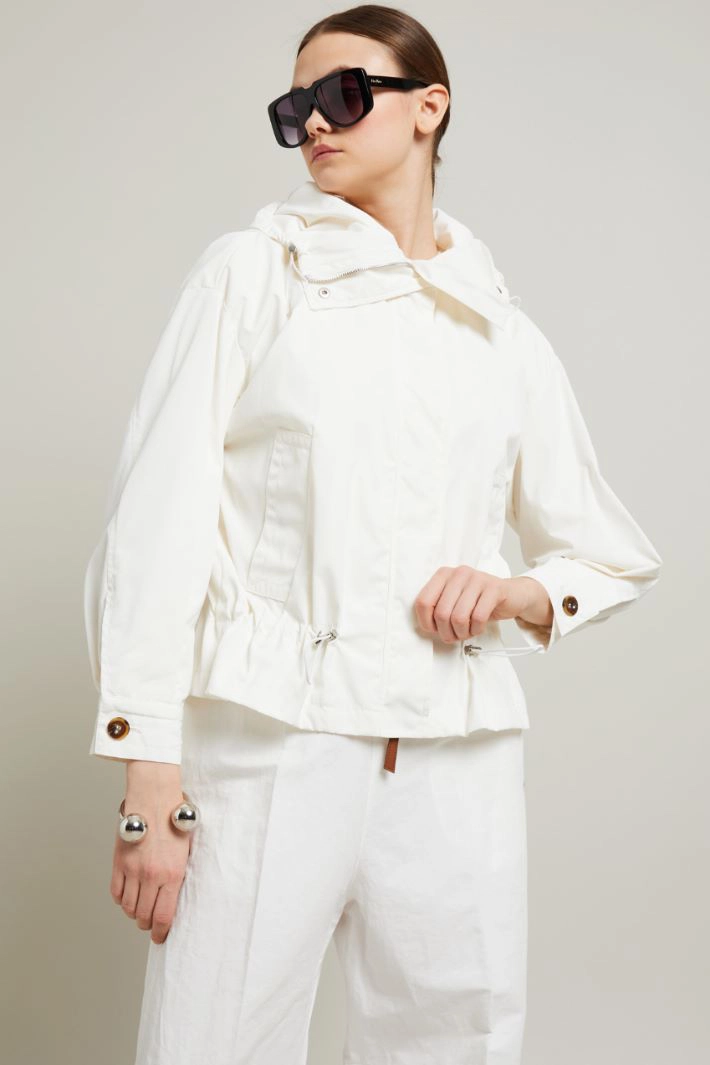 Straight-fit jacket in technical fabric with hood, high collar and long sleeves with cuffs. Flap pockets. Zip fastening