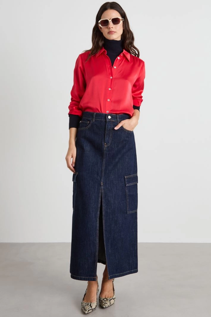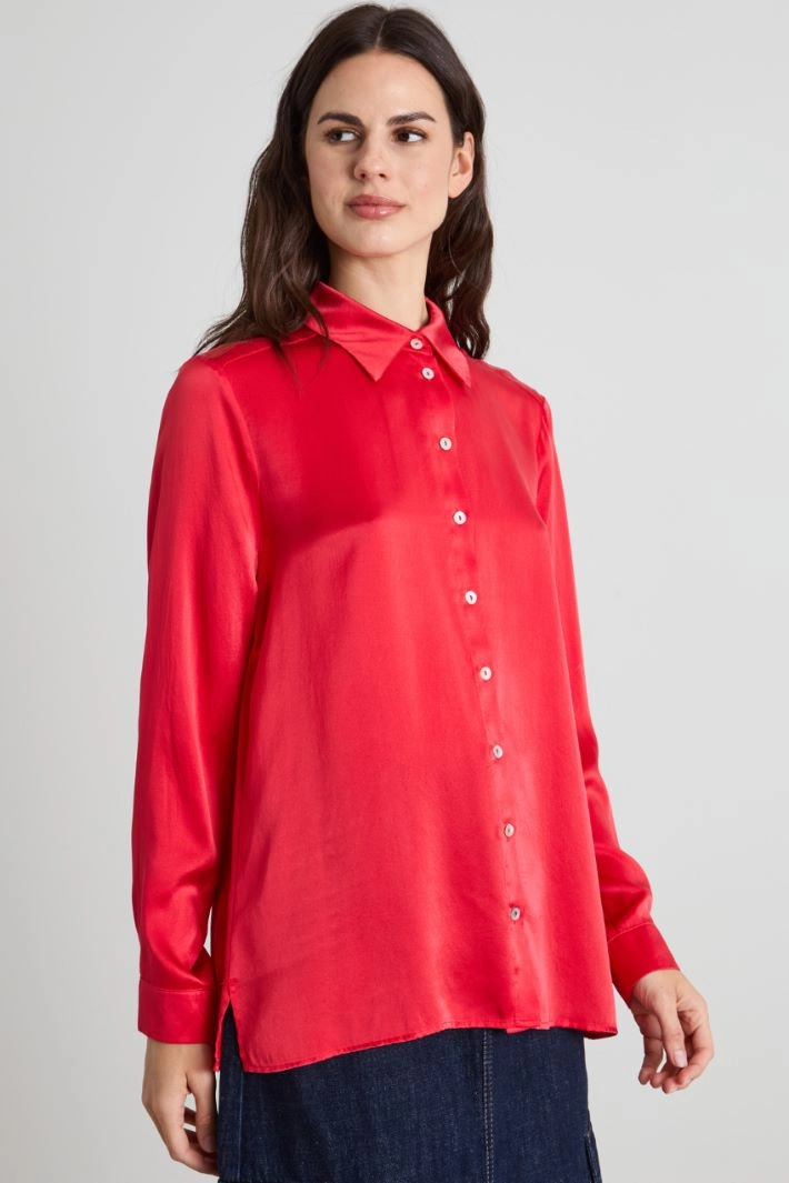 Flowing shirt in pure silk satin, with classic collar, long sleeves with cuff and button, yoke cut with counter pleat on the back and side slits with visible button fastening.