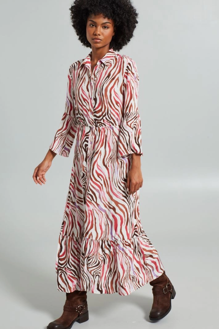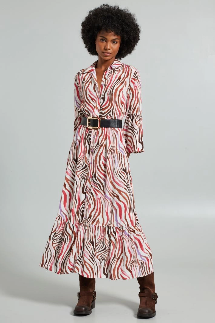 Flared midi shirt dress in pure viscose fabric with fil coupé details, classic collar, three-quarter bell sleeves, gathered waist and flounced bottom. Button fastening.