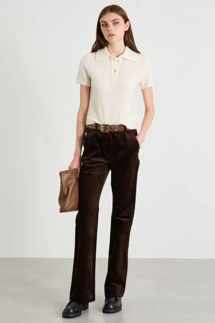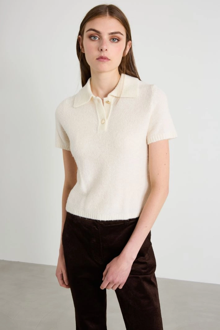 Cropped, straight-cut polo-style sweater made from yarn-dyed wool-blend bouclé yarn, with a classic collar, V-neck opening with buttons and short sleeves.