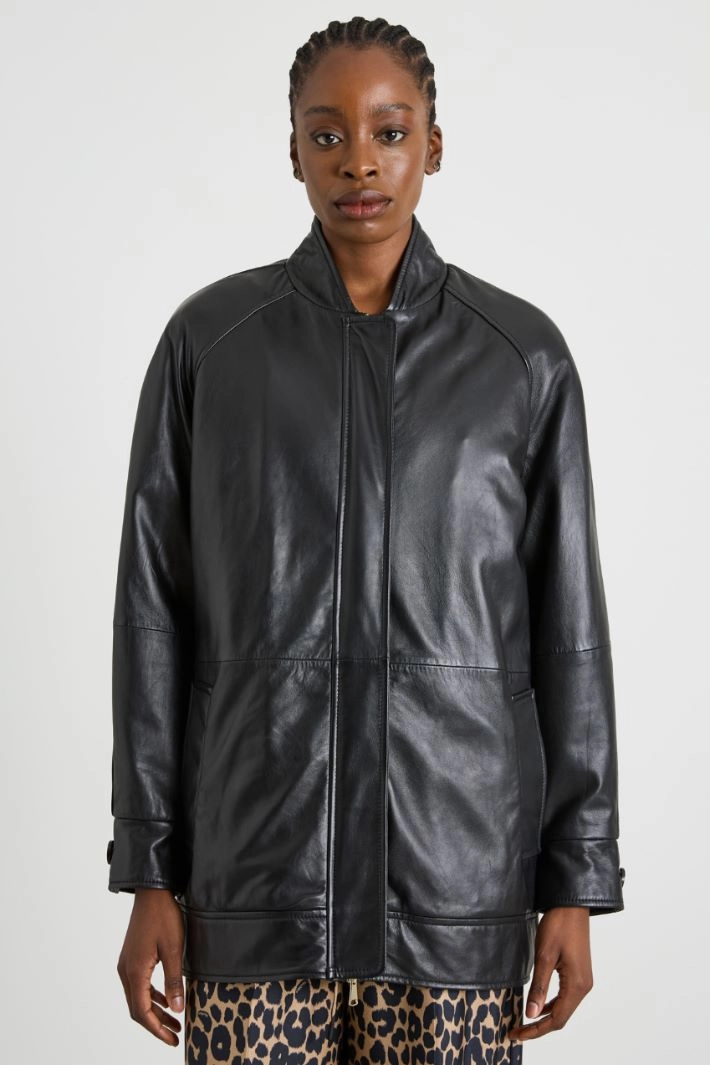 Padded bomber jacket with a straight cut in genuine leather, with a stand-up collar, long sleeves with cuff and button, side welt pockets and a knitted edge on the back. Fastening with a double-slider zip.