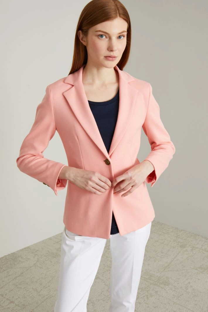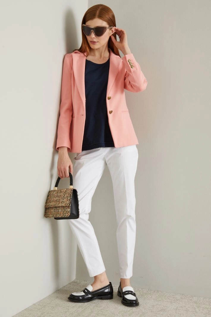 Slightly fitted blazer in stretch viscose blend jersey, with lapel collar, long sleeves with buttons, double welt side pockets and single-breasted button fastening. Lined.