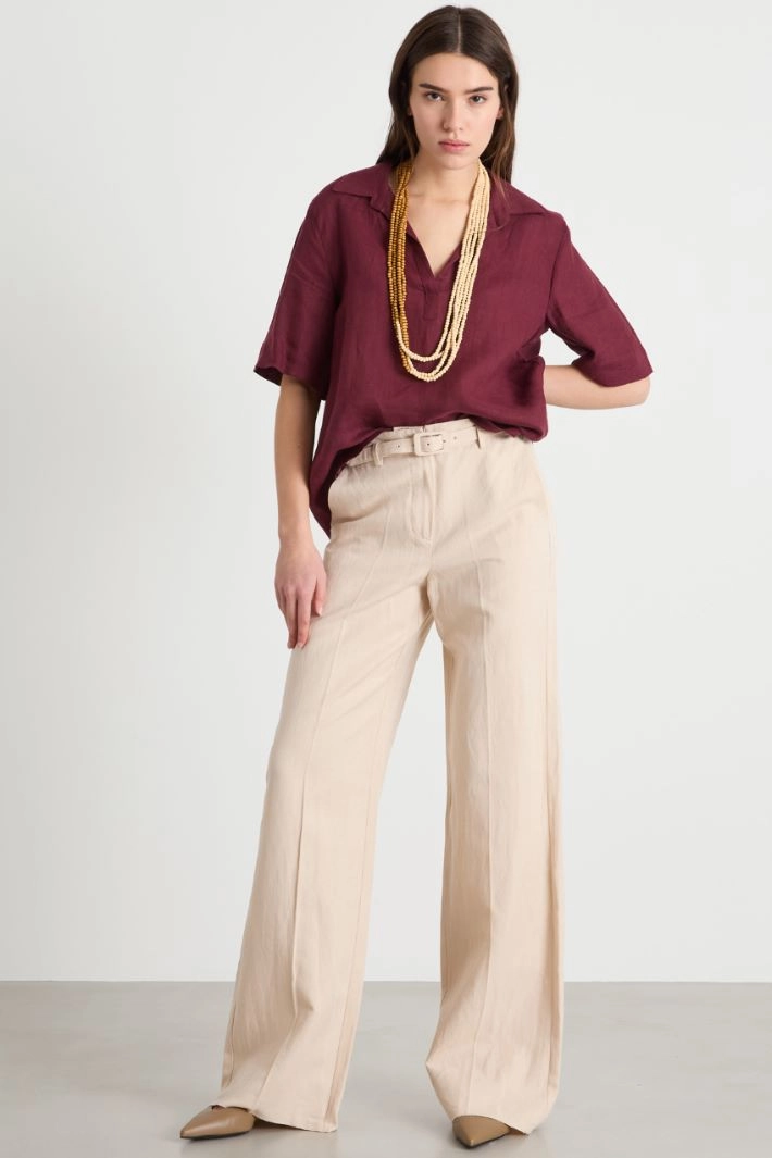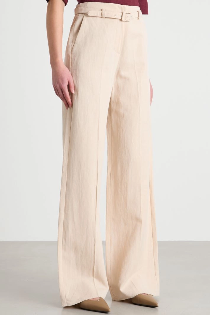 Wide-leg trousers in a linen and cotton-blend slub twill, featuring front pleats, French pockets and faux welt pockets on the back. Fastening with a hook-and-bar, zip and belt.