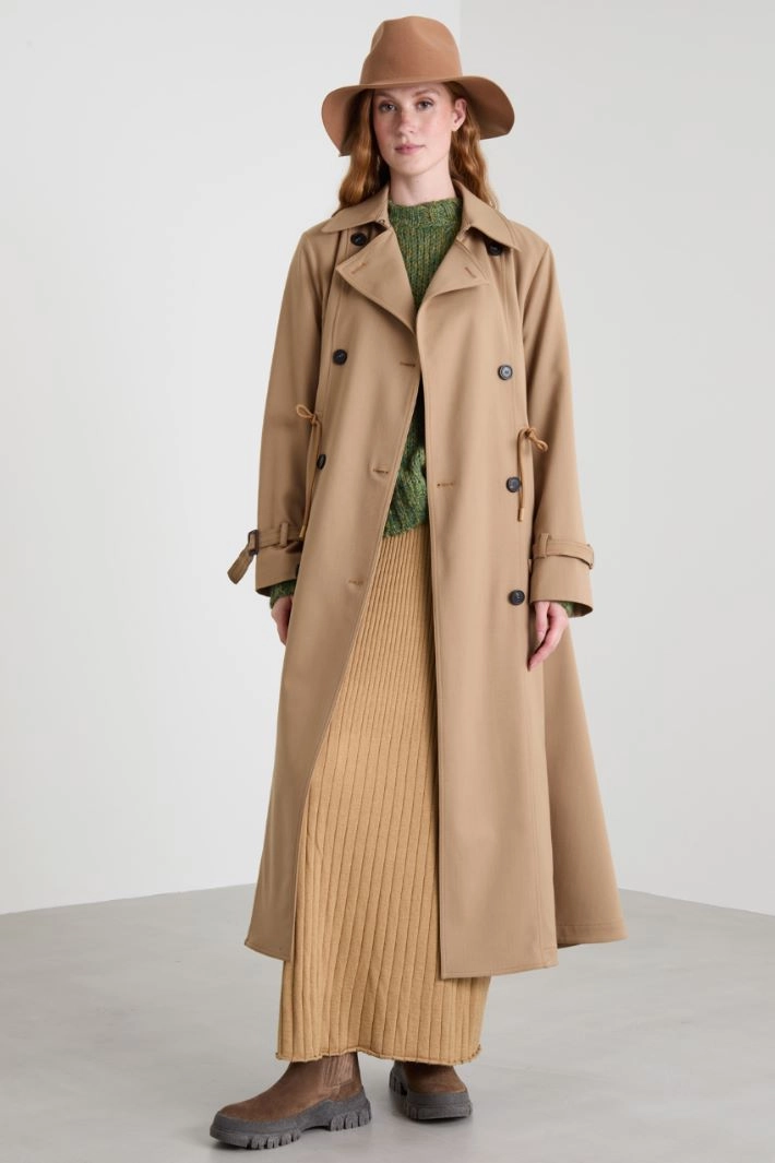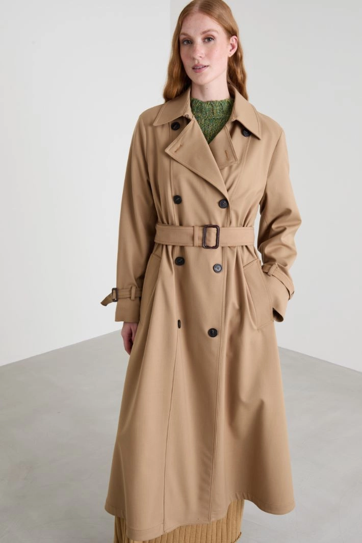 Double-breasted flared trench coat in water-resistant stretch wool blend fabric, with a lapel collar, long sleeves with a strap at the wrist, a drawstring waist and side welt pockets. Central slit on the back and button fastening. Matching belt. Semi-lined garment.