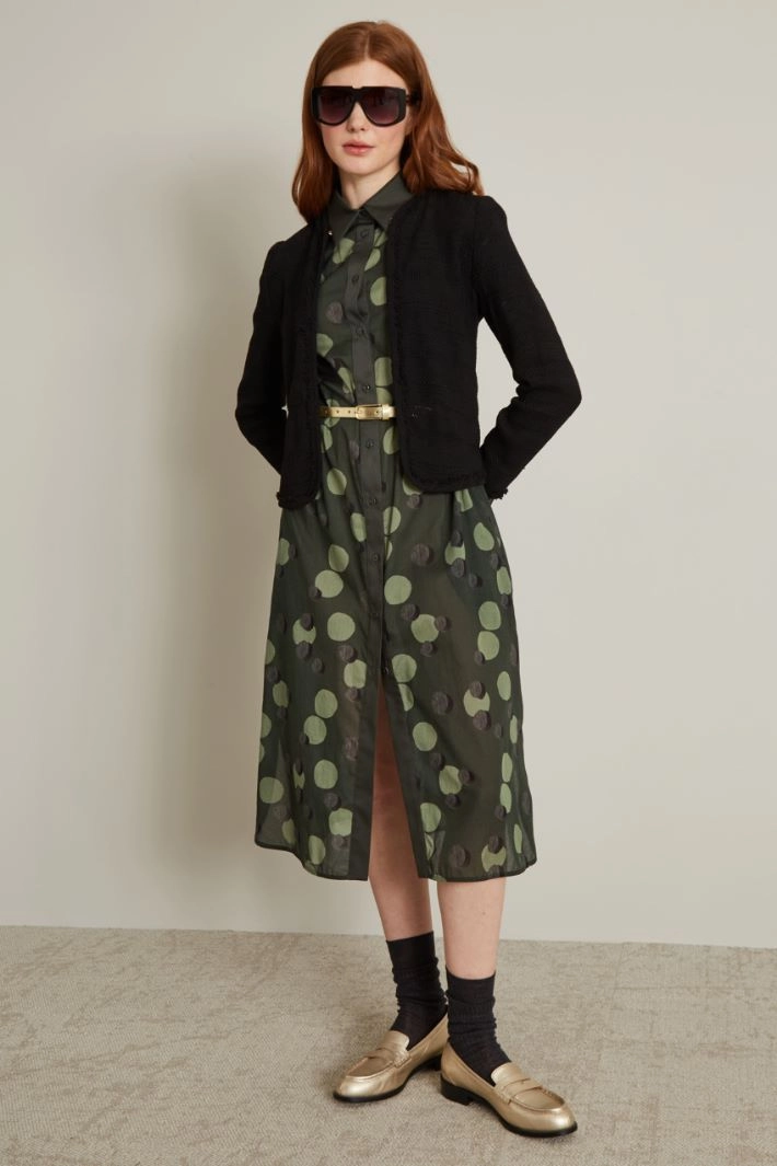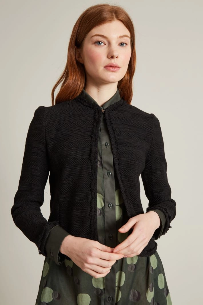 Straight-cut jacket in a cotton-blend perforated fabric, with a crew neck, long sleeves, frayed edges and hook fastening. Unlined.