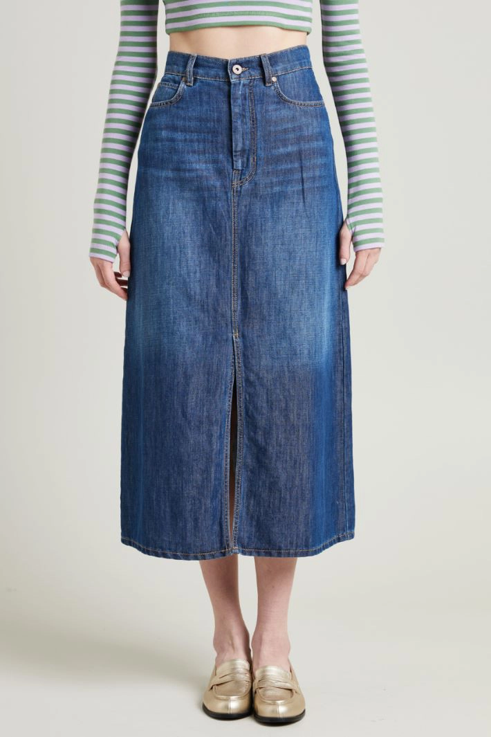 Flared midi skirt in cotton and linen denim, with belt loops, five pockets, a central slit on the front and fastening with a hidden zip and button.