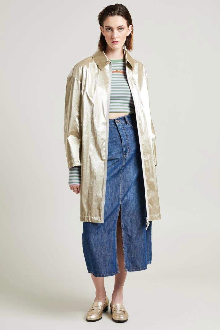 Machine wash cold delicate cycle; do not bleach; do not tumble dry; line drying in the shade; cool iron; do not dry clean.; wash the garment while it is fastened.; don’t iron the labels.; take care when wearing light-coloured clothes or accessories because, with the heat of the body, the indigo fabric , may fade and stain. be careful while sitting on light coloured surfaces, especially if wet. wash garments separately and always turned inside out. hang the garment turned inside out by avoiding to expose it to direct sunlight. avoid removing isolated stains.; contains non-textile parts of animal origin.