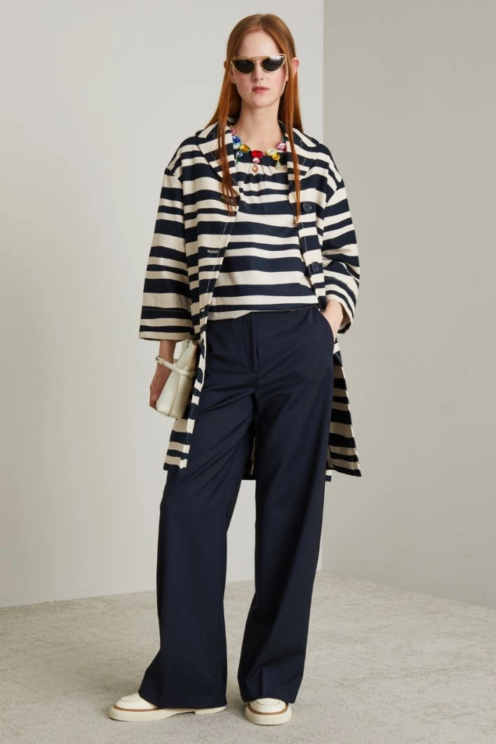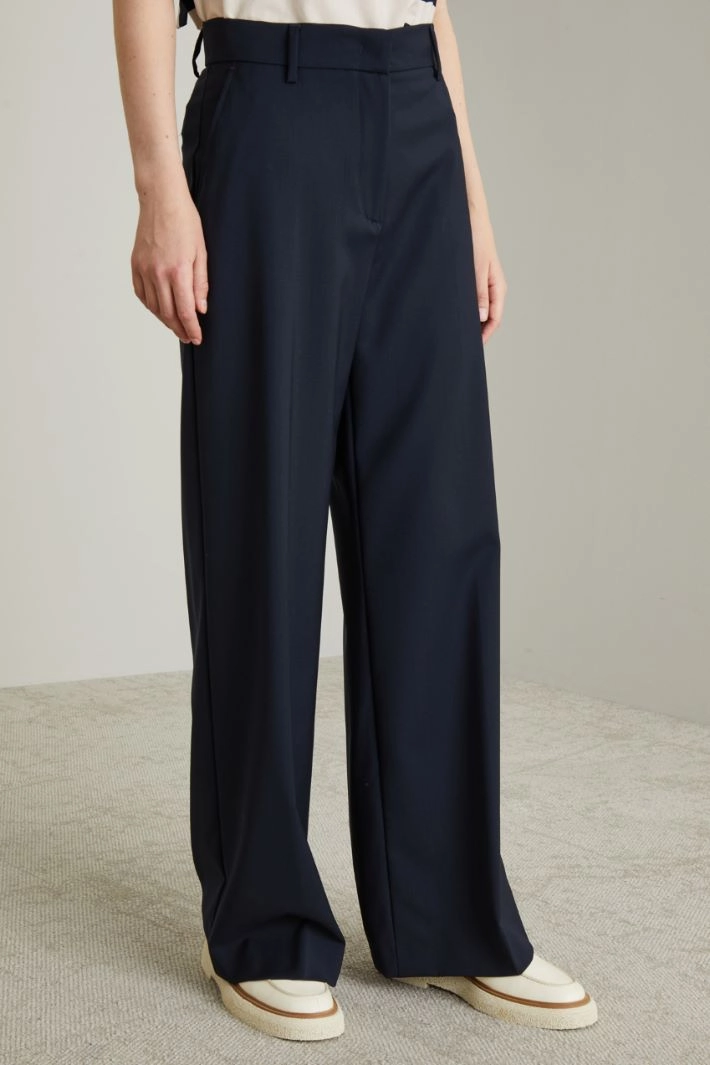 Straight-fit, loose trousers in pure wool canvas, with belt loops at the waist, side French pockets and buttoned welt pockets on the back, crease pressed lengthwise and hidden fastening with zip, button and hook.