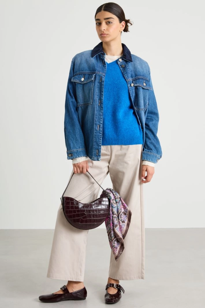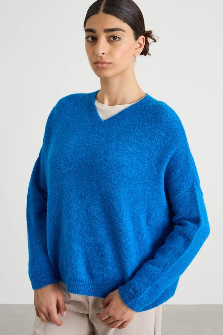 Oversized sweater in soft yarn, with V-neck, long dropped sleeves and ribbed trims.