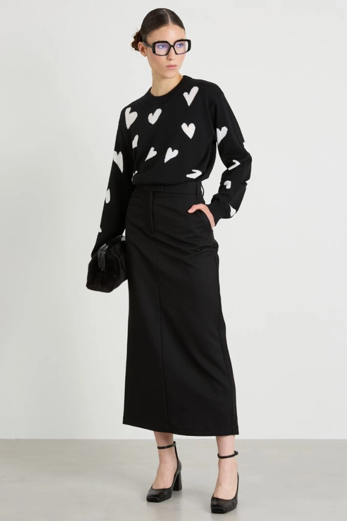 Regular-fit sweater in pure wool yarn, with inlay work on the front, crew neck, long dropped sleeves and ribbed edges.