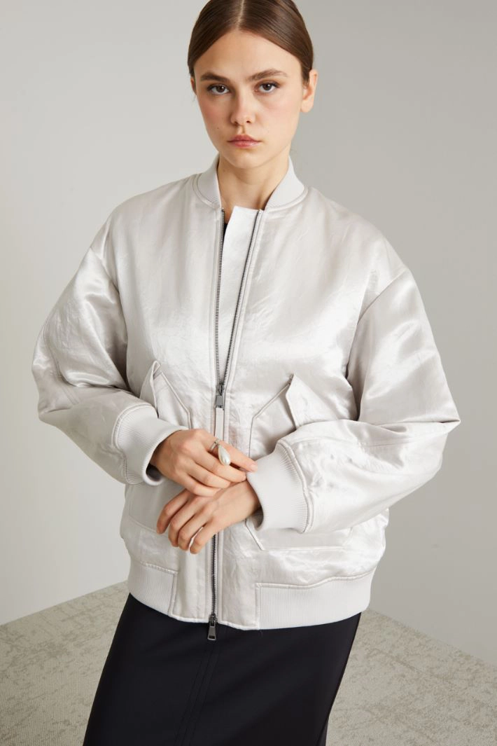 Oversized bomber jacket in padded technical satin, ribbed round neck, long set-in sleeves with cuff and patch pockets with flap. Zip fastening.