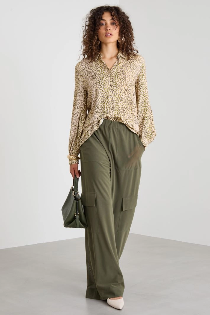 Straight-cut cargo trousers in technical tulle with internal lining, elasticated waistband, French pockets and patch pockets with flap along the leg.