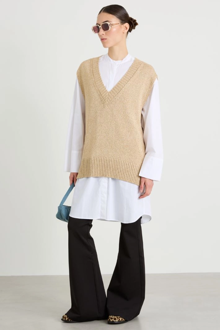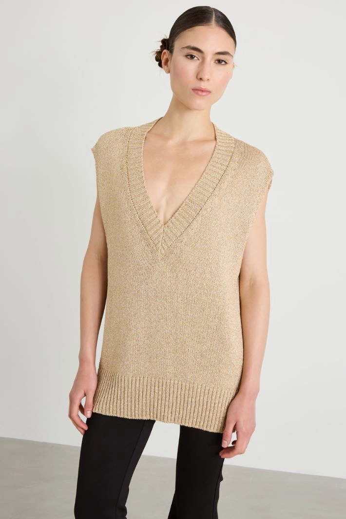 Oversized waistcoat in lamé viscose yarn, with V-neck, side slits, asymmetrical hem and ribbed edges.