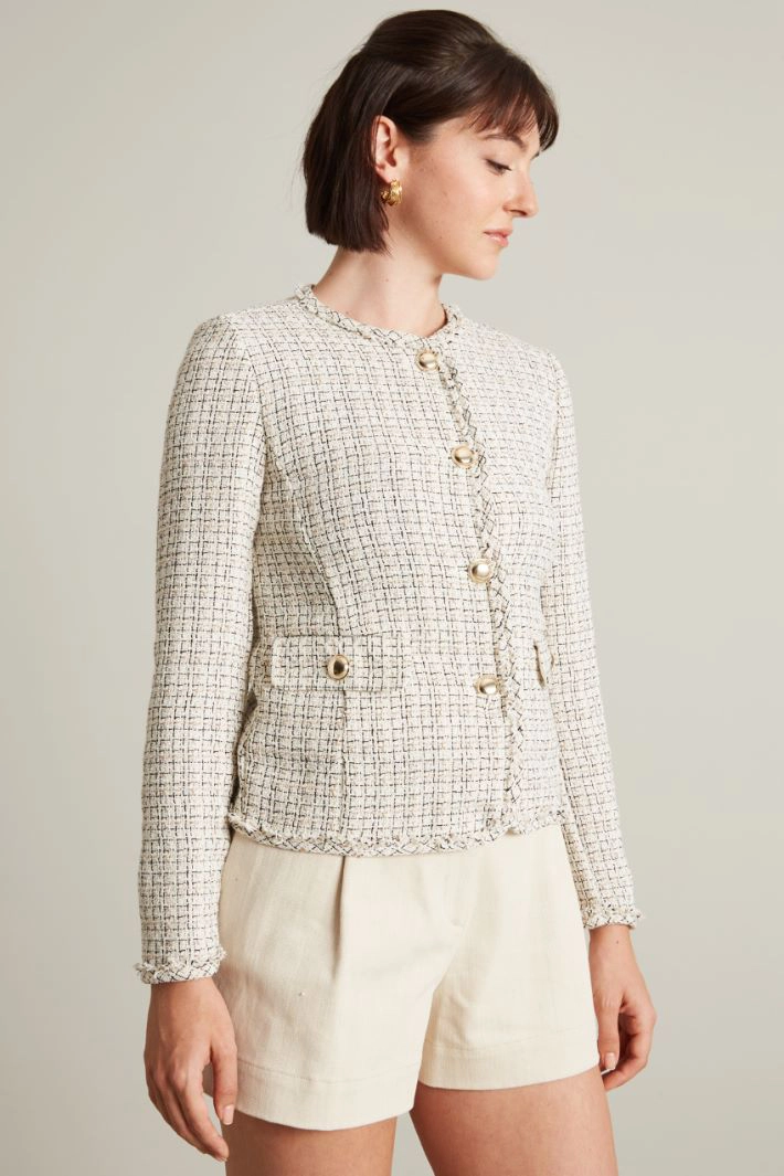 Straight-cut jacket in yarn-dyed cotton blend tweed, with lamé fiber insert, crew neck, long sleeves, side welt pockets with flap and button and frayed edges. Single-breasted fastening with metal buttons. Unlined.