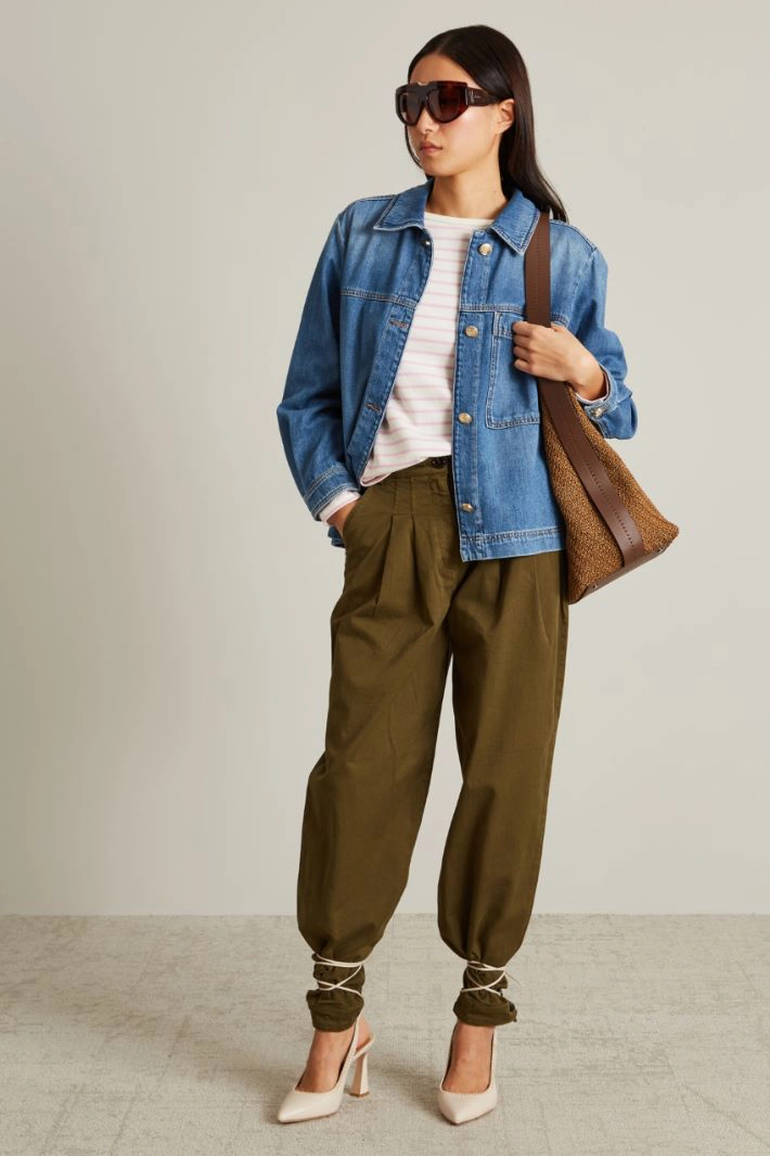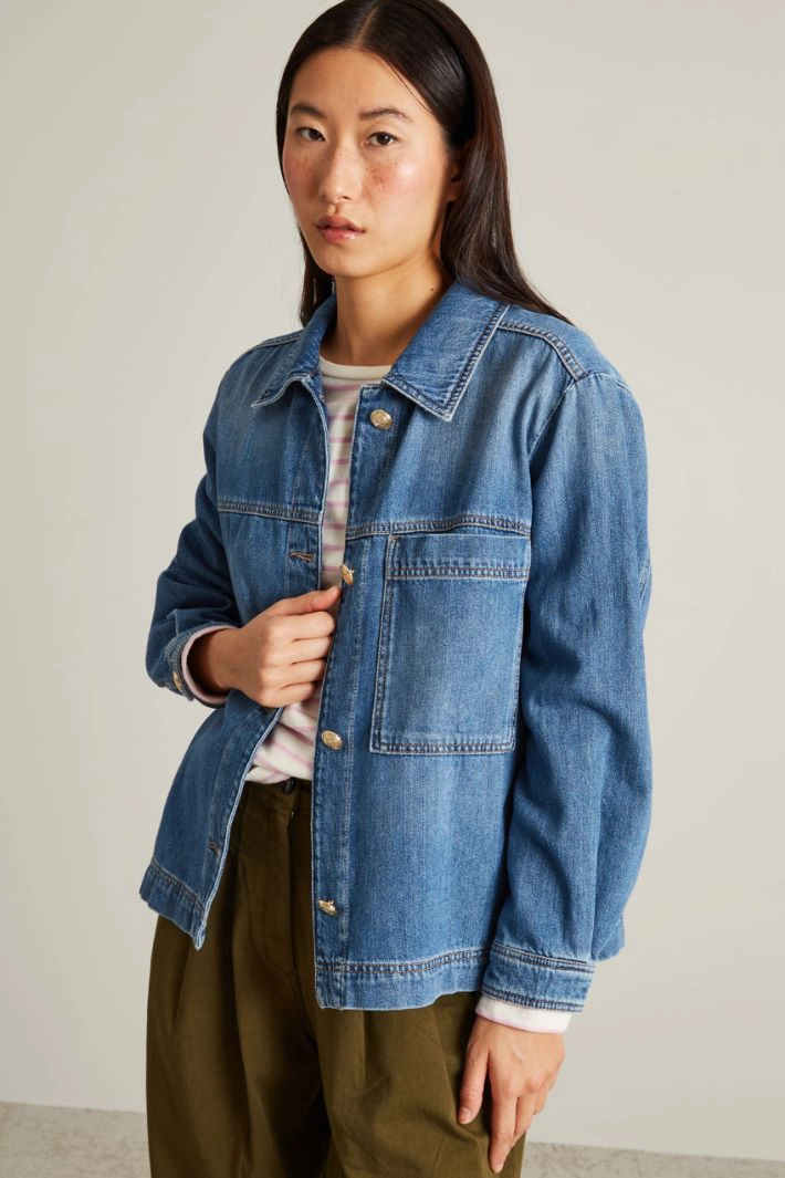 Straight-fit shirt jacket in pure cotton denim, with classic collar, long sleeves with cuff and button, patch pocket on the chest and button fastening. Unlined.
