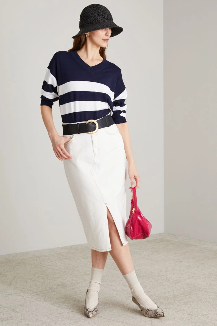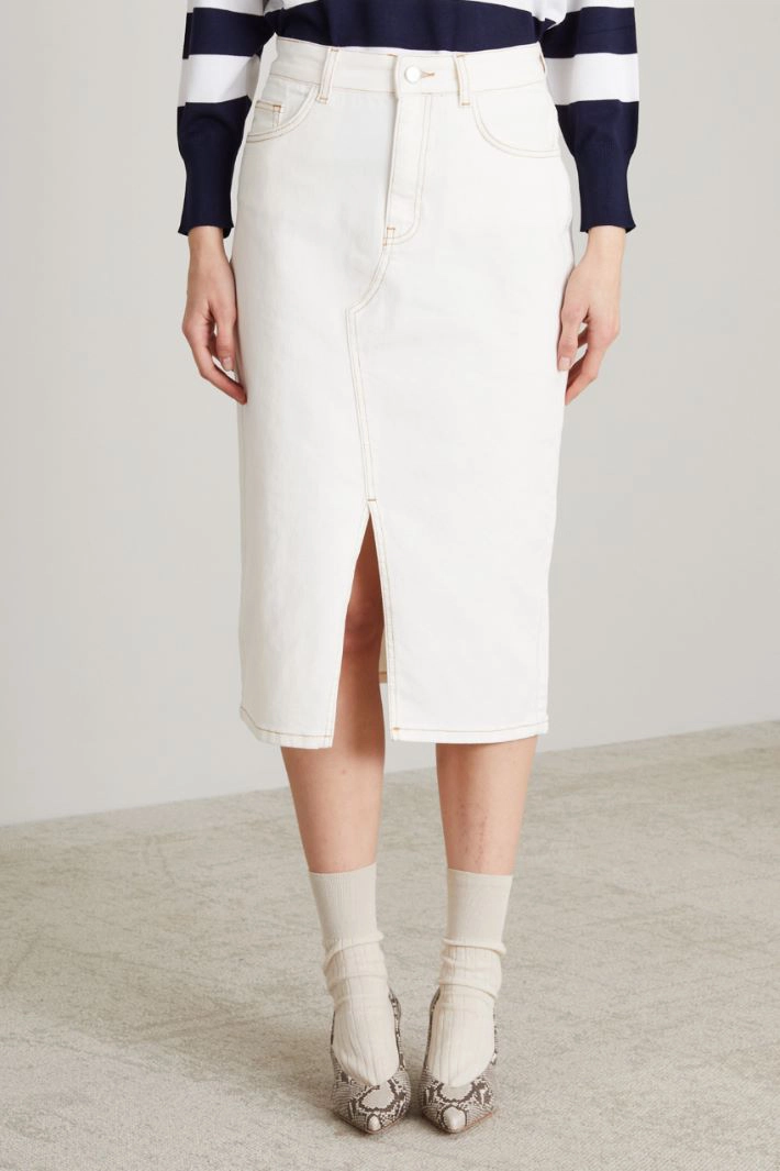 Pencil skirt in stretch cotton denim, with belt loops, five pockets and a slit at the bottom on the front. Fastening with a hidden zip and metal button.