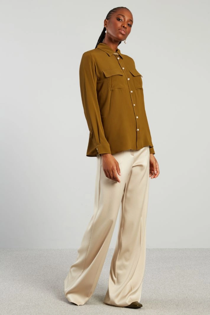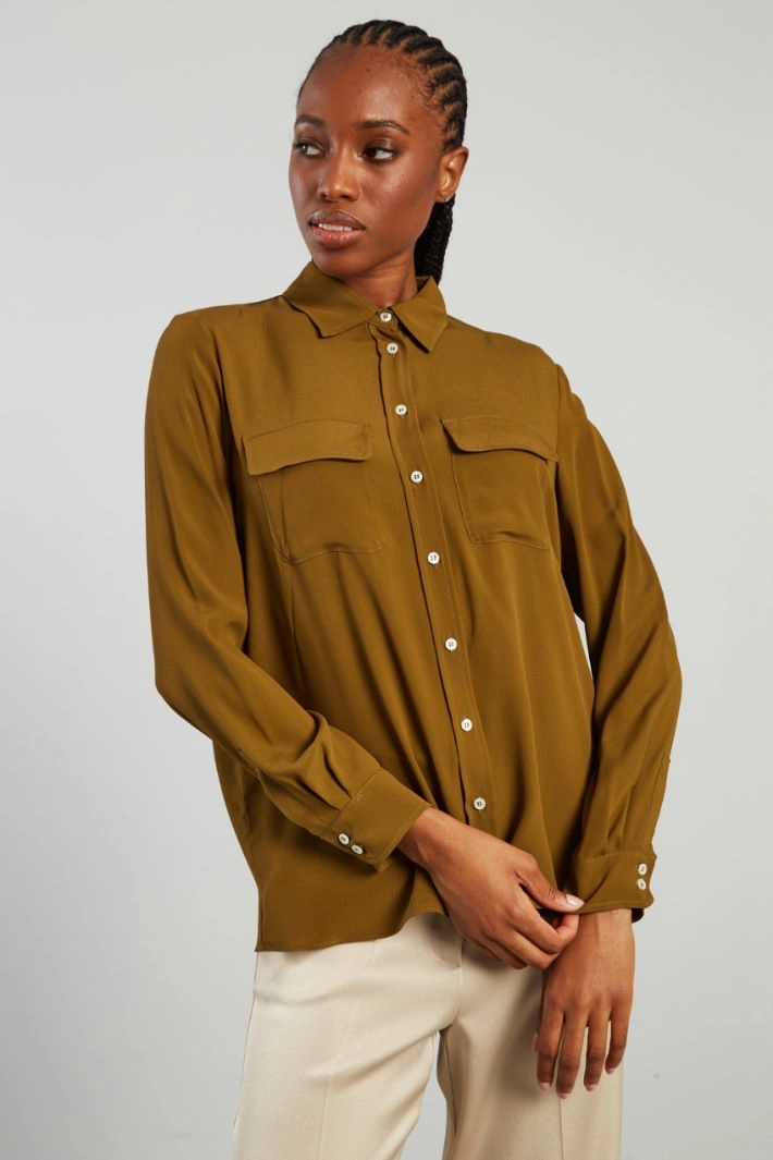 Fluid shirt in silk blend crepe de chine, with classic collar, long sleeves with cuff and buttons, patch pockets with flap on the chest and yoke cut with box pleat on the back. Button fastening.