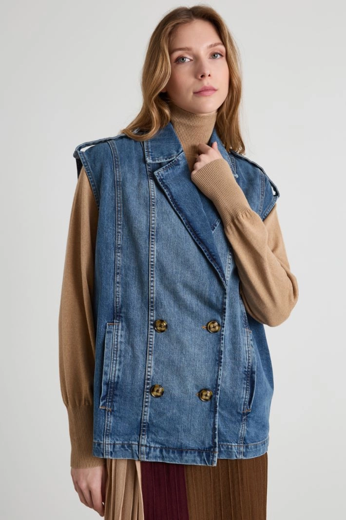 Straight-fit denim gilet with lapel collar, sleeveless and front welt pockets. Double-breasted fastening with buttons.