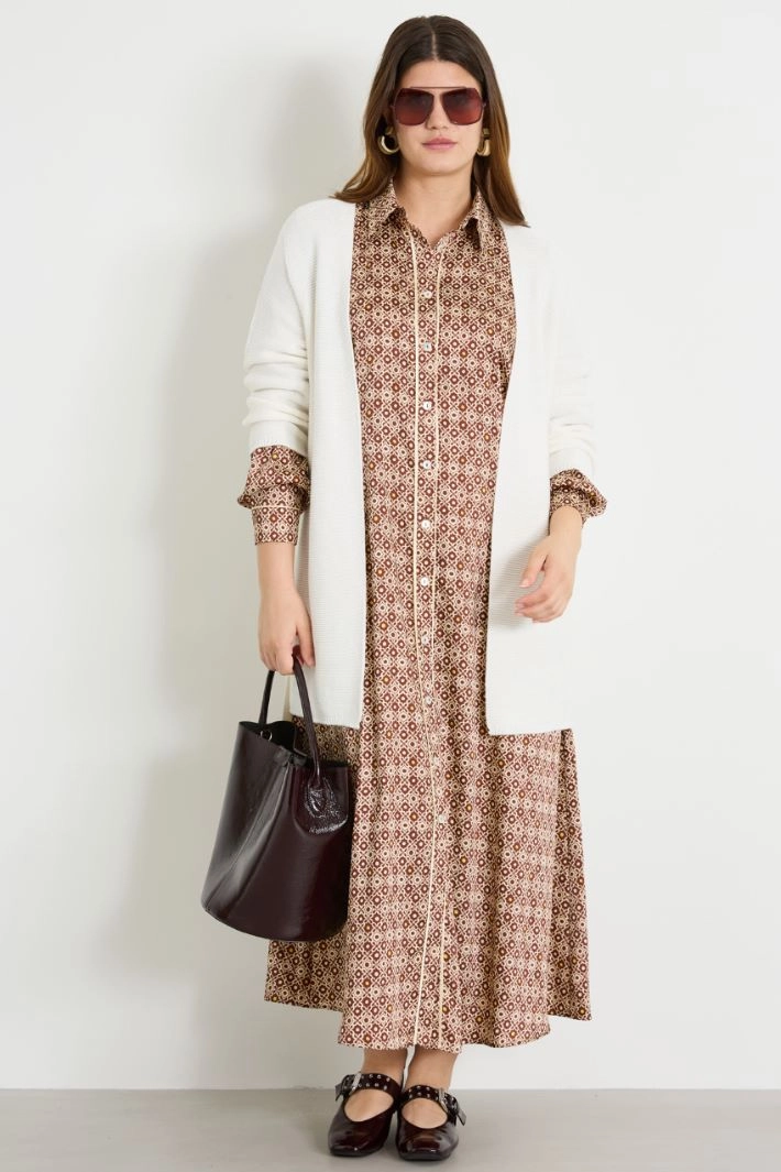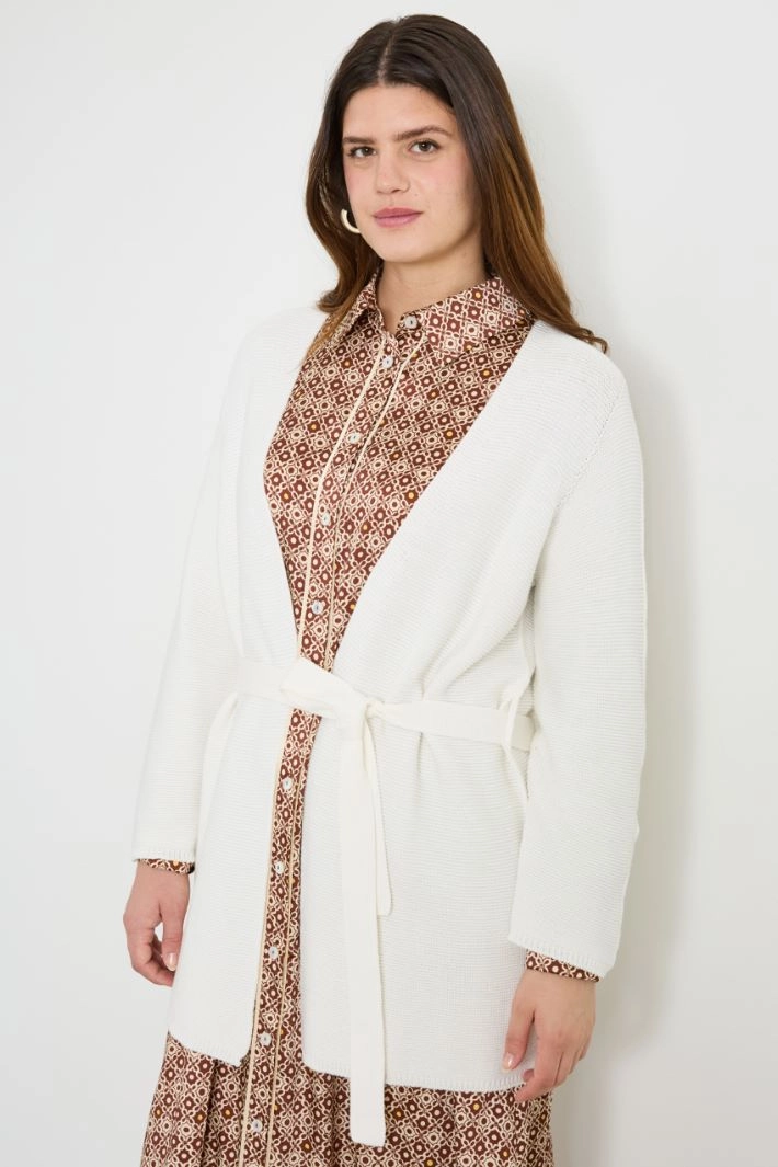 Straight-cut cardigan in pure cotton yarn, with raised knit, V-neck, long sleeves and fastening with a matching belt.