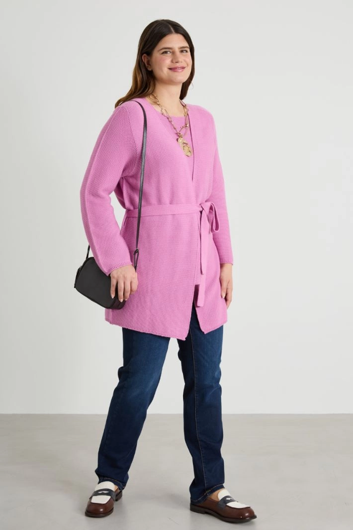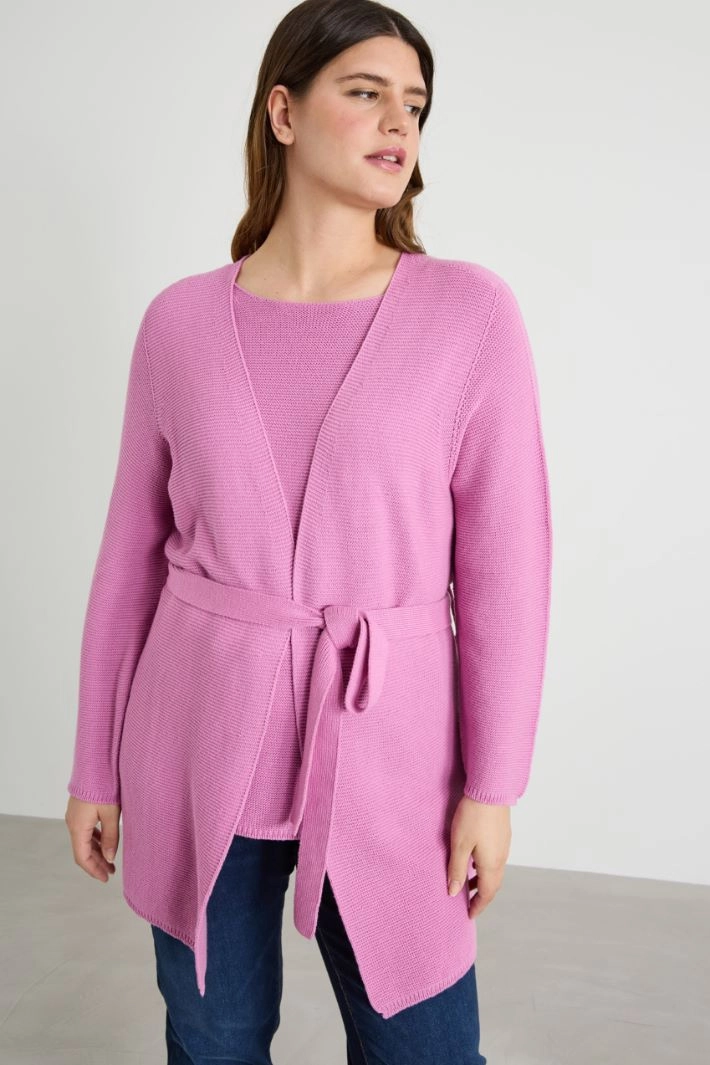 Straight-cut cardigan in pure cotton yarn, with raised knit, V-neck, long sleeves and fastening with a matching belt.