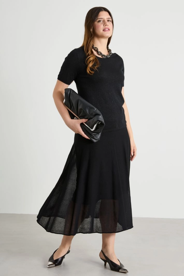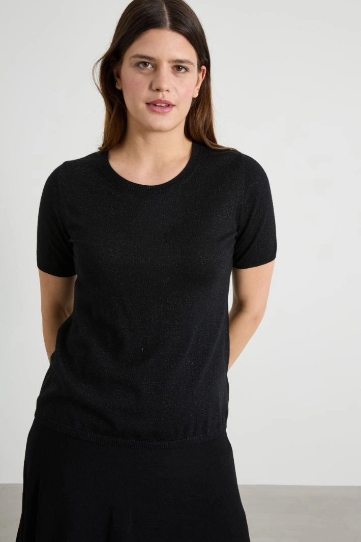 Straight-cut sweater in lamé wool blend yarn, with a crew neck and short sleeves.