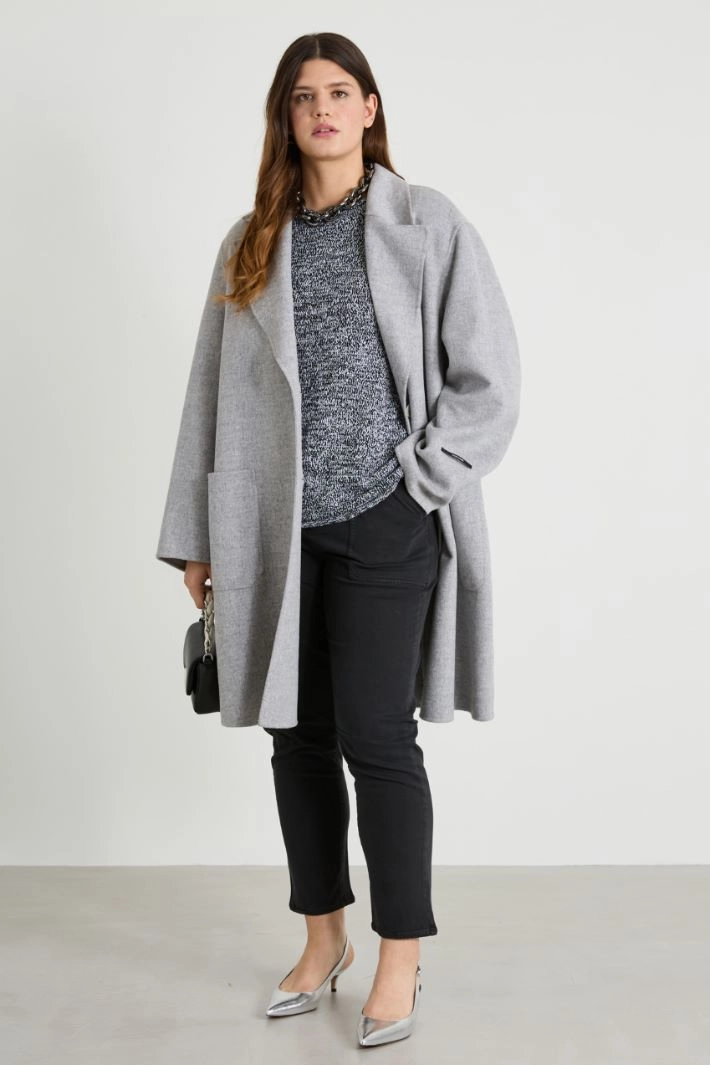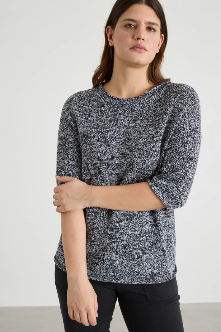 Straight-cut sweater in wool blend yarn, with a boat neckline and elbow-length sleeves.