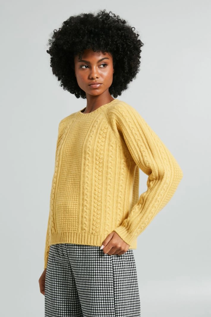 Crew neck sweater in pure wool yarn with long raglan sleeves and multi knit pattern.