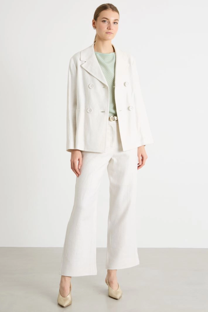 A straight-cut jacket crafted from a stretch linen-blend basketweave. The design features classic lapels, long sleeves and welt pockets, and is completed by a double-breasted button fastening.