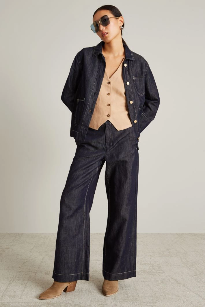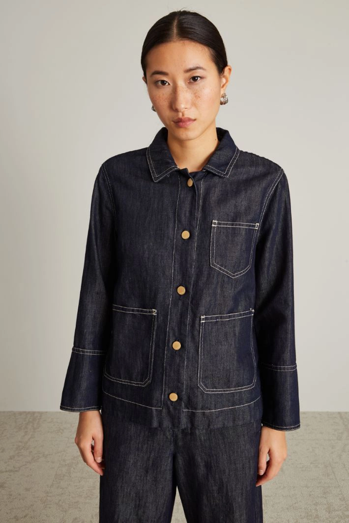 Straight-fit shirt-style jacket in cotton and linen denim, with contrasting stitching, shirt collar, long sleeves with maxi cuff, patch pockets and single-breasted button fastening. Unlined.
